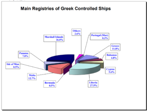 Ο ελεγχόμενος από την Ελλάδα στόλος είναι νηολογημένος κάτω από περίπου 32 σημαίες. Συνολικά, οι σημαίες της Λιβερίας και της Νήσου Μάρσαλ βρίσκονται στην πρώτη γραμμή του ελληνόκτητου στόλου με 1.159 και 1.096 ελληνόκτητα πλοία, αντίστοιχα, στα νηολόγιά τους. Όσον αφορά το DWT, η Λιβερία αντιπροσωπεύει 104.171.885, αντιπροσωπεύοντας το 29,3%, και οι Νήσοι Μάρσαλ αντιπροσωπεύουν το 86.425.552, αντιπροσωπεύοντας το 24,3% του συνολικού DWT του ελληνόκτητου στόλου.