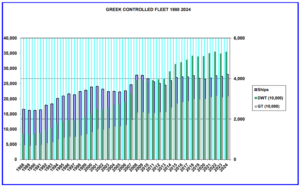 Σε σύγκριση με τα αντίστοιχα στοιχεία του προηγούμενου έτους, δείχνουν ότι κατά τη διάρκεια του έτους έως τον Μάρτιο του 2024, ο ελληνόκτητος στόλος αυξήθηκε ως προς τον αριθμό των πλοίων, DWT και GT. Σύμφωνα με τα στοιχεία, στις 4 Μαρτίου 2024, τα ελληνικά συμφέροντα έλεγχαν ρεκόρ 4.212 πλοίων διαφόρων κατηγοριών, 355.209.500 συνολικά DWT και 208.252.588 συνολικά GT. Σε σύγκριση με τα στοιχεία του προηγούμενου έτους, αυτό αντιπροσωπεύει αύξηση 102 πλοίων, 5.992.356 DWT και 3.905.226 GT. Τα στοιχεία δεν περιλαμβάνουν 373 πλοία διαφόρων κατηγοριών που βρίσκονται σε παραγγελία από ναυπηγεία, συνολικής χωρητικότητας 33.143.130 DWT και 22.889.399 GT. Είναι ενδιαφέρον ότι τα στοιχεία του βιβλίου παραγγελιών αντιπροσωπεύουν αύξηση 50% στις νέες παραγγελίες, γεγονός που υποδηλώνει μεγαλύτερο ενδιαφέρον για πλοία νέας τεχνολογίας από Έλληνες πλοιοκτήτες. Για πρώτη φορά μετά από αρκετά χρόνια, ο στόλος που είναι νηολογημένος υπό ελληνική σημαία παρέμεινε σταθερός όσον αφορά τον αριθμό των πλοίων, εξακολουθώντας να περιλαμβάνει 496 πλοία. Αυτό αντανακλά το θετικό αποτέλεσμα των πρόσφατων μεταρρυθμίσεων στο ελληνικό νηολόγιο. Ωστόσο, σημειώθηκε μικρή μείωση όσον αφορά τα DWT και GT, με τα στοιχεία να ανέρχονται πλέον σε 30.759.394 GT και 51.694.269 DWT, σε σύγκριση με τα στοιχεία του προηγούμενου έτους που ήταν 31.150.523 GT και 52.768.867 DWT.
