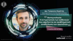 Τo Ίδρυμα Ευγενίδου πραγματοποιεί την Τετάρτη 7 Απριλίου 2021 και ώρα 18.00 webcast με τίτλο «Βιοτεχνολογία: Η αντιμετώπιση των ασθενειών που οφείλονται σε προβληματική αναδίπλωση των πρωτεϊνών», με καλεσμένο ομιλητή τον Δρα Γεώργιο Σκρέτα, Kύριο Ερευνητή στο Ινστιτούτο Χημικής Βιολογίας του Εθνικού Ιδρύματος Ερευνών & Ιδρυτή της ResQ Biotech.