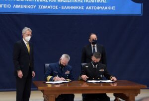 Μνημόνιο συνεργασίας με στόχο την προώθηση και την εμβάθυνση των σχέσεων του Λιμενικού Σώματος – Ελληνικής Ακτοφυλακής με την Αμερικανική Ακτοφυλακή, υπεγράφη σήμερα στο Υπουργείο Ναυτιλίας και Νησιωτικής Πολιτικής, παρουσία του Υπουργού Ναυτιλίας και Νησιωτικής Πολιτικής Γιάννη Πλακιωτάκη και του Αμερικανού Πρέσβη στην Αθήνα, Τζέφρι Πάγιατ.