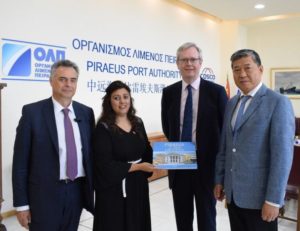 ο Αναπληρωτής Δ/ντος Συμβούλου ΟΛΠ Α.Ε. κ. Άγγελος Καρακώστας, η Υπουργός Ναυτιλίας και Μεταφορών του Ηνωμένου Βασιλείου Ms. Nusrat Ghani, ο Αναπληρωτής της Πρέσβεως της Βρετανικής Πρεσβείας στην Αθήνα, κ. Τζέιμς Μπράις και ο Αναπληρωτής Διευθύνοντος Συμβούλου ΟΛΠ Α.E. Captain Weng Lin.
