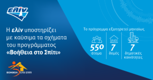 Η ελίν, με σεβασμό και υπευθυνότητα, αναδεικνύει διαχρονικά τον ανθρωποκεντρικό της χαρακτήρα μέσα από δράσεις κοινωνικής προσφοράς και αλληλεγγύης που στηρίζουν έμπρακτα ευπαθείς ομάδες της κοινωνίας μας. Έτσι, στο πλαίσιο του προγράμματος Εταιρικής Κοινωνικής Ευθύνης «ώθηση» και σε συνεργασία με το Athens Partnership, υποστήριξε το πρόγραμμα «Βοήθεια στο Σπίτι» του Δήμου Αθηναίων, το οποίο στέκεται στο πλευρό των συμπολιτών μας της τρίτης ηλικίας, με κινητικές δυσλειτουργίες και ειδικά προβλήματα που χρειάζονται υποστήριξη, προσφέροντάς τους ιατρική, ψυχολογική ή άλλη βοήθεια κατ’ οίκον, με στόχο τη βελτίωση της ποιότητας ζωής τους.
