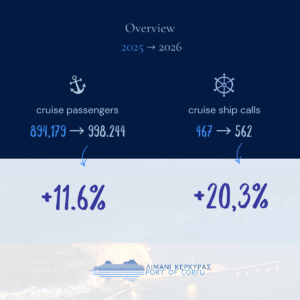 Για το 2026 έχουν προγραμματιστεί συνολικά 562 προσεγγίσεις κρουαζιερόπλοιων, αριθμός που αποτυπώνει αύξηση της τάξης του 20,3% σε σχέση με τον προηγούμενο χρόνο και ενισχύει περαιτέρω τη θέση της Κέρκυρας στο διεθνές δίκτυο της κρουαζιέρας. Με βάση τον υφιστάμενο προγραμματισμό, αναμένεται η επίσκεψη 998.244 εκατομμυρίου επιβατών, με τα διαθέσιμα στοιχεία να καταδεικνύουν τάση υπέρβασης του ορίου αυτού, καθώς η ζήτηση για την Κέρκυρα ενισχύεται τόσο στην υψηλή όσο και στη λεγόμενη «ώριμη» και εκτός αιχμής περίοδο.