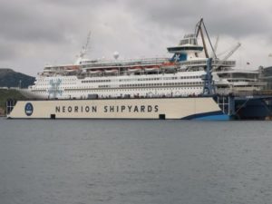 Το πρώτο κρουαζιερόπλοιο μπήκε για επισκευές στο Νεώριο Σύρου, μετά την επαναλειτουργία των ναυπηγείων τον Απρίλιο του 2018. Πρόκειται για το Celestyal Olympia της Celestyal Cruises, το οποίο αυτή τη στιγμή επισκευάζεται στη μεγάλη πλωτή ανακαινισμένη δεξαμενή «Βιολάντω».