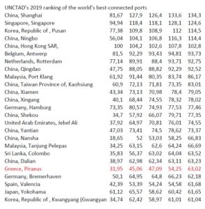 Πρώτο σε βαθμολογία συνδεσιμότητας σύμφωνα με στοιχεία έκθεσης του United Nations Conference on Trade and Development (UNCTAD) κατετάγη το λιμάνι της Shanghai στην Κίνα. Ειδικότερα το εν λόγω λιμάνι συγκέντρωσε 134 μονάδες με το λιμάνι της Σιγκαπούρης να ακολουθεί με 124,63 μονάδες, το Μπουσάν με 114,45 μονάδες, το Νίγκμπο με 114,35 μονάδες την Αμβέρσα με 94 μονάδες και το Ρότερνταμ με 93 μονάδες. Ο δείκτης Liner Shipping Connectivity (LSCI) περιλαμβάνει – «ελέγχει» 900 λιμάνια ανά τον κόσμο και στην τελευταία κατάταξη ως γνωστόν έχει αναγορεύσει το λιμάνι του Πειραιά (ΟΛΠ-COSCO) ως το καλύτερο διασυνδεδεμένο λιμάνι στη Μεσόγειο. Να σημειωθεί ότι στη σχετική κατάταξη ο Πειραιάς καταλαμβάνει την 21η θέση από την 29 περσι και μόλις την 47η το 2006.