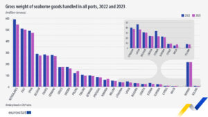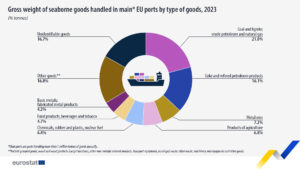 Το 2023, οι θαλάσσιοι λιμένες της ΕΕ διαχειρίστηκαν περίπου 3,4 δισεκατομμύρια τόνους εμπορευμάτων (συνολικό μεικτό βάρος). Ο όγκος των εμπορευματικών μεταφορών μειώθηκε κατά 3,9% σε σύγκριση με το 2022 (3,5 δισεκατομμύρια τόνοι) και αυξήθηκε κατά 5,0% σε σύγκριση με το 2013 (3,2 δισεκατομμύρια τόνοι).