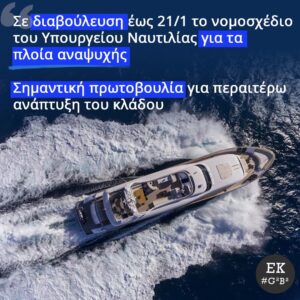 Τέθηκε από τις 7/1 έως 21/1/2022 σε δημόσια ηλεκτρονική διαβούλευση η νομοθετική πρωτοβουλία του Υπουργείου Ναυτιλίας & Νησιωτικής Πολιτικής, υπό τον τίτλο «Εκσυγχρονισμός του θεσμικού πλαισίου για τη δραστηριοποίηση των πλοίων αναψυχής και των τουριστικών ημερόπλοιων, την ενίσχυση της ανταγωνιστικότητας του κλάδου των επαγγελματικών πλοίων αναψυχής και άλλες διατάξεις».