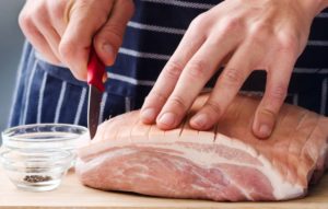 Εκτός από το μαρινάρισμα, νοστιμίζουμε τα μεγάλα κομμάτια του χοιρινού ως εξής: κάνουμε μικρές τομές σε διάφορα σημεία του κρέατος με ένα μικρό μαχαίρι. Οι τομές δεν πρέπει να είναι μεγάλες, γιατί τότε το κρέας μπορεί να χάσει τους χυμούς του κατά το ψήσιμο. Στις οπές που θα δημιουργηθούν βάζουμε μικρές ποσότητες από μια «πάστα» που φτιάχνουμε με ψιλοκομμένο ή λιωμένο σκόρδο, λάδι, μουστάρδα, μυρωδικά και μπαχαρικά. Με όσο από το μείγμα περισσέψει αλείφουμε το κρέας ολόγυρα. Αν έχουμε πάρει κομμάτι με το δέρμα, το χαράσσουμε με ένα μαχαίρι, «ριγωτά» ή σε καρεδάκια, μέχρι να φτάσουμε στο υποδόριο λίπος. Αλείφουμε το κρέας με την «πάστα» που φτιάξαμε, φροντίζοντας να εισχωρήσει στις τομές. Μάλιστα, με το δέρμα κομμένο κατ’ αυτόν τον τρόπο, το λίπος θα λιώσει και η πέτσα θα γίνει ιδιαίτερα νόστιμη και τραγανή.