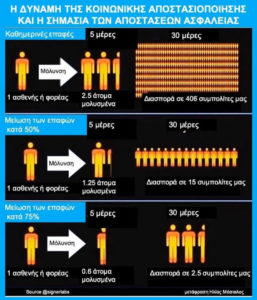 Η πρώτη στήλη, που φορά τις καθημερινές επαφές δείχνει ότι ένας ασθενής ή φορέας μπορεί να μολύνει σε 5 ημέρες 2,5 άτομα και με τη διασπορά σε 30 μέρες να φτάνει σε 406 συμπολίτες μας.