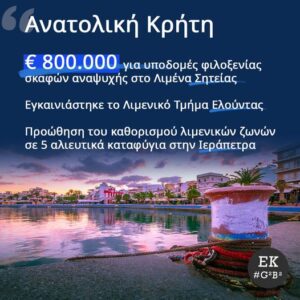Σημειώνεται, ότι ο σχεδιασμός της ολοκληρωμένης αναβάθμισης του ρόλου του λιμανιού της Σητείας, περιλαμβάνει την ενίσχυση των υποδομών για το θαλάσσιο τουρισμό, την ενίσχυση και αναβάθμιση των ακτοπλοϊκών συνδέσεων από και προς τη Σητεία, την προώθηση έργων αποκατάστασης του παράκτιου μετώπου, καθώς και παρεμβάσεις αισθητικής αναβάθμισης εντός της χερσαίας ζώνης.