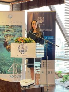 Δήλωση της Γενικής Γραμματέως κας Νταϊφά: «Το επετειακό λογότυπο για τα 40 χρόνια της HELMEPA προέρχεται από τον ζωγραφικό πίνακα της ταλαντούχας Ελληνίδας εικαστικού, κυρίας Μαρίας Φιλοπούλου, η οποία εμπνέεται διαχρονικά από τη μεγαλοσύνη της θάλασσας και μοιράζεται το έργο της για τον ‘ιερό σκοπό’ όπως είχε πει και ο αείμνηστος Γιώργος Λιβανός, ιδρυτής της Ένωσης, για να μας βοηθήσει να αναδείξουμε, να εμπνεύσουμε, το βασικό μας μήνυμα, ‘η θάλασσα είναι ζωή’».