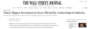 Οι Έλληνες γραφειοκράτες όρθωσαν ένα τεράστιο εμπόδιο σε μια από τις μεγαλύτερες επενδύσεις της Κίνας στην Ευρώπη, σημειώνει με δηκτικό τρόπο η Wall Street Journal αναφερόμενη στην απόφαση του Κεντρικού Αρχαιολογικού Συμβουλίου (ΚΑΣ) να γνωμοδοτήσει υπέρ της κήρυξης μέρους του Πειραιά ως αρχαιολογικού χώρου, δημιουργώντας με αυτόν τον τρόπο καθυστερήσεις στο κινεζικό project υποδομών.